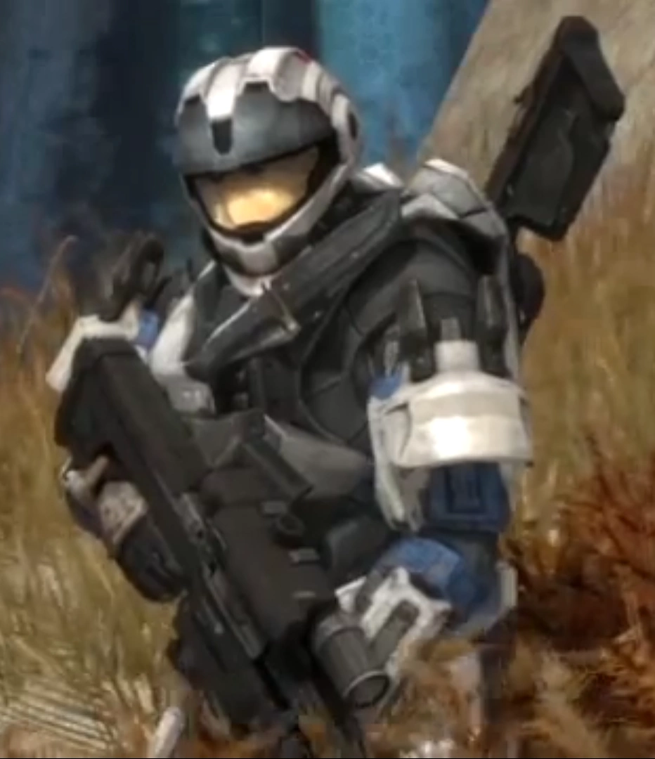 In Halo: Reach, he dons a CQC Helmet, JFO Shoulders, and UA/COUNTERASSAULT Chest and Default Kneepads.