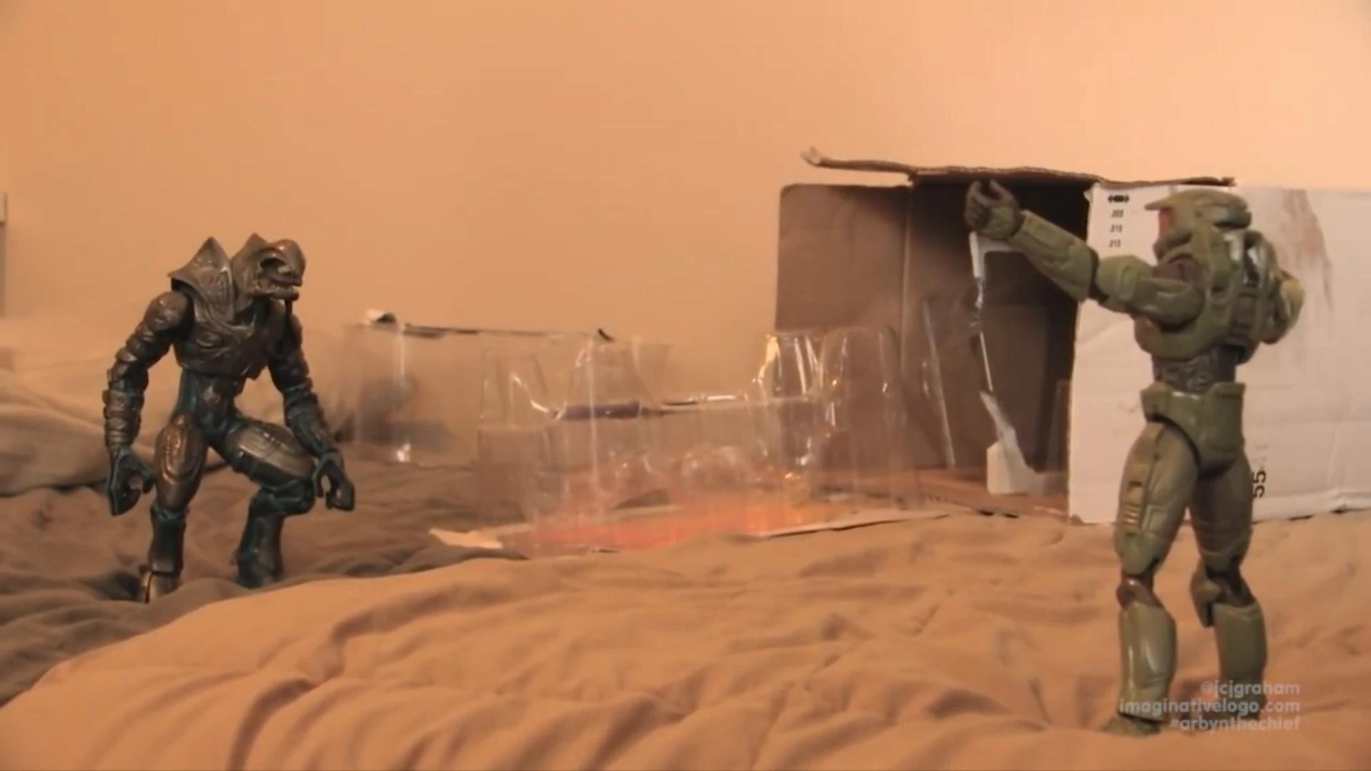 | The toys are back inexplicably in Jon's room after being dead for four years. While Chief searches for Jon's copy of Halo: Reach so he can play it and troll people online, Arbiter uses Jon's computer and internet connection to catch up on current world affairs. | ||||